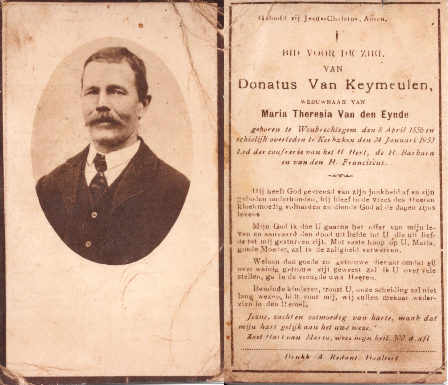 | Van Keymeulen Donatus | Van den Eynde Maria Thérèsia | Woubrechtegem | 08/04/1856 | Kerksken | 24/01/1933 |