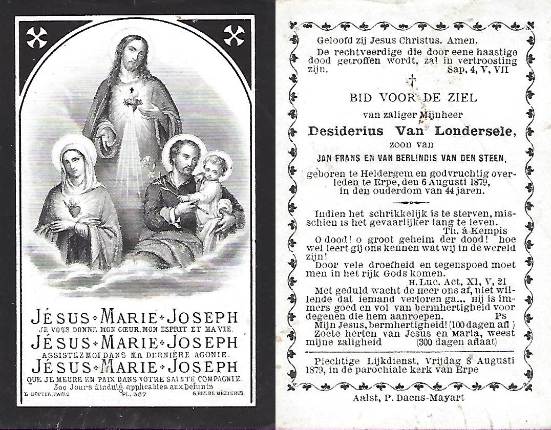 | Van Londersele Desiderius | Heldergem | 28/07/1834 | Erpe | 06/11/1879 | |