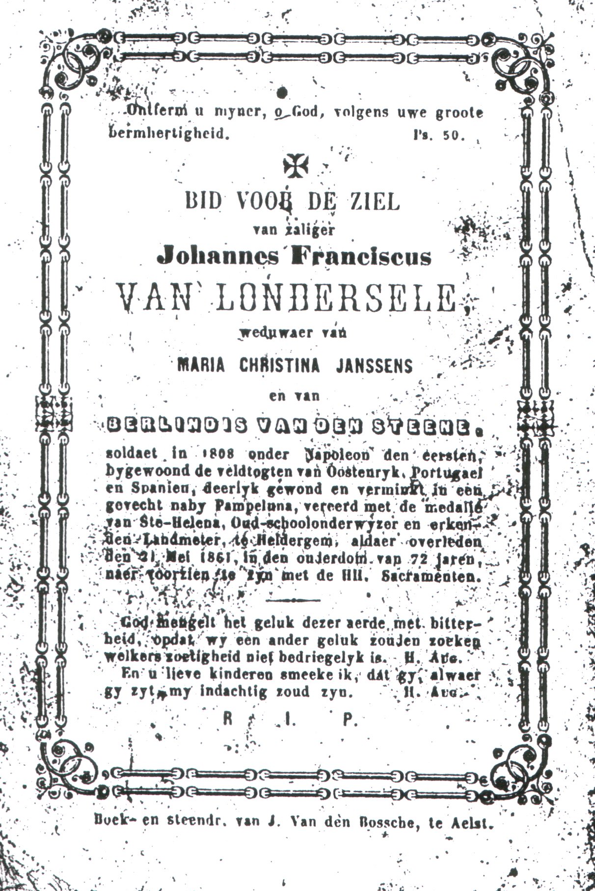 | Van Londersele Johannes Franciscus | Janssens Maria Christina en Van Den Steene Berlindis | Kerksken | 14/10/1789 | Heldergem | 21/05/1861 |