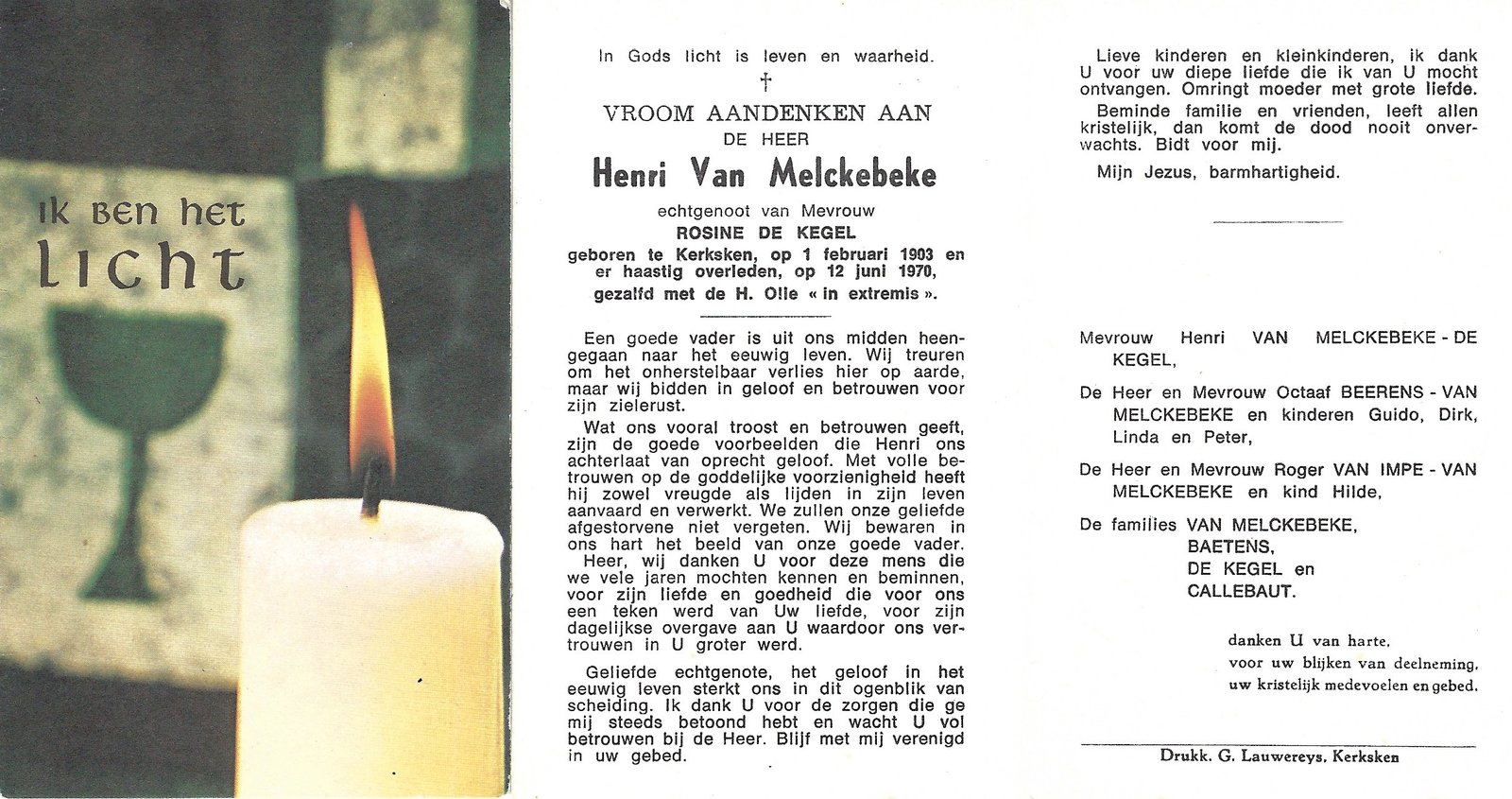 | Van Melckebeke Henri | De Kegel Rosine | Kerksken | 01/02/1903 | Kerksken | 12/06/1970 |