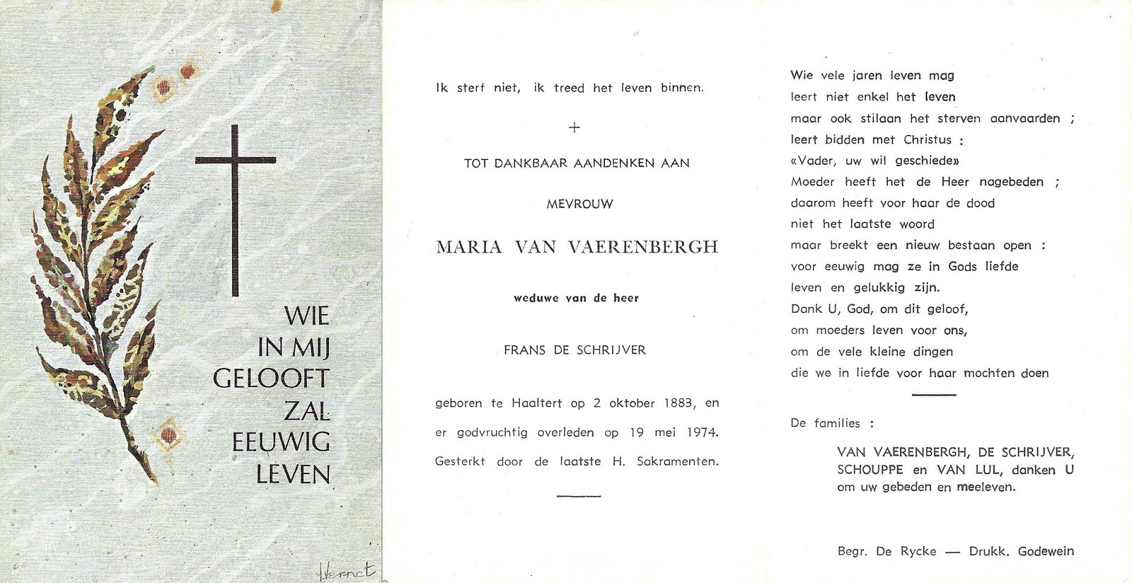 | Van Vaerenbergh Maria | De Schrijver Frans | Haaltert | 02/10/1883 | Haaltert | 19/05/1974 |