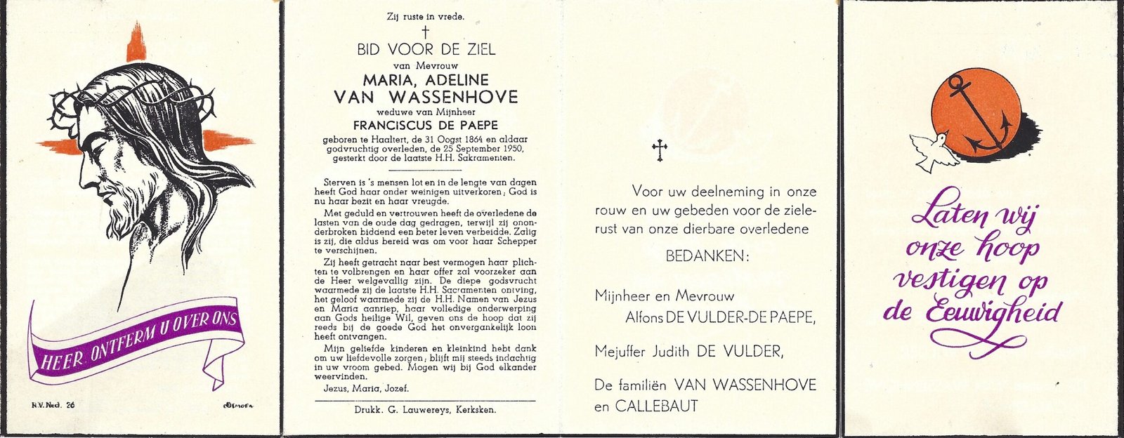 | Van Wassenhove Maria Adelina | De Paepe Franciscus | Haaltert | 31/08/1864 | Haaltert | 25/09/1950 |