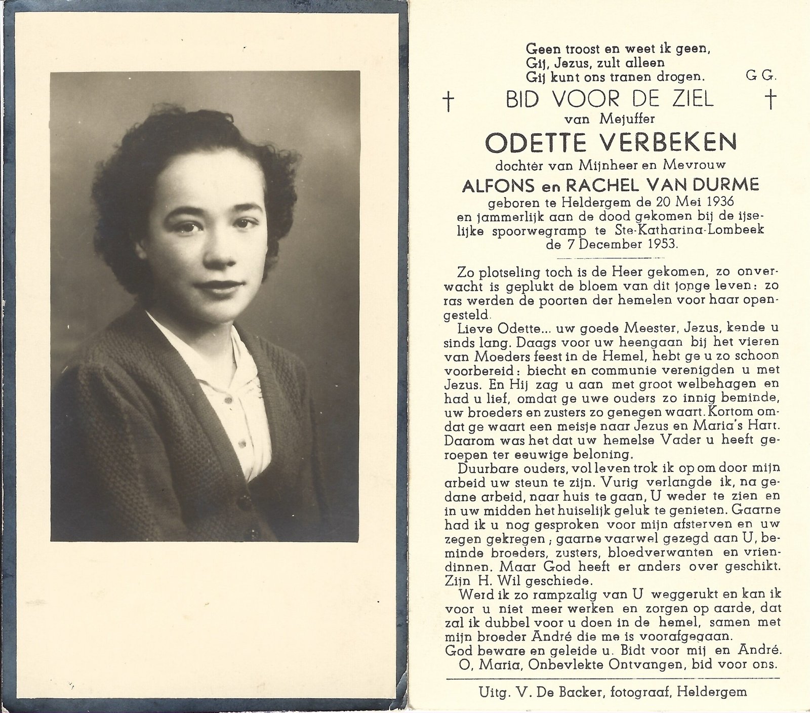 | Verbeken Odette | Heldergem | 20/05/1936 | Sint-Katherina-Lombeek | 07/12/1953 | |