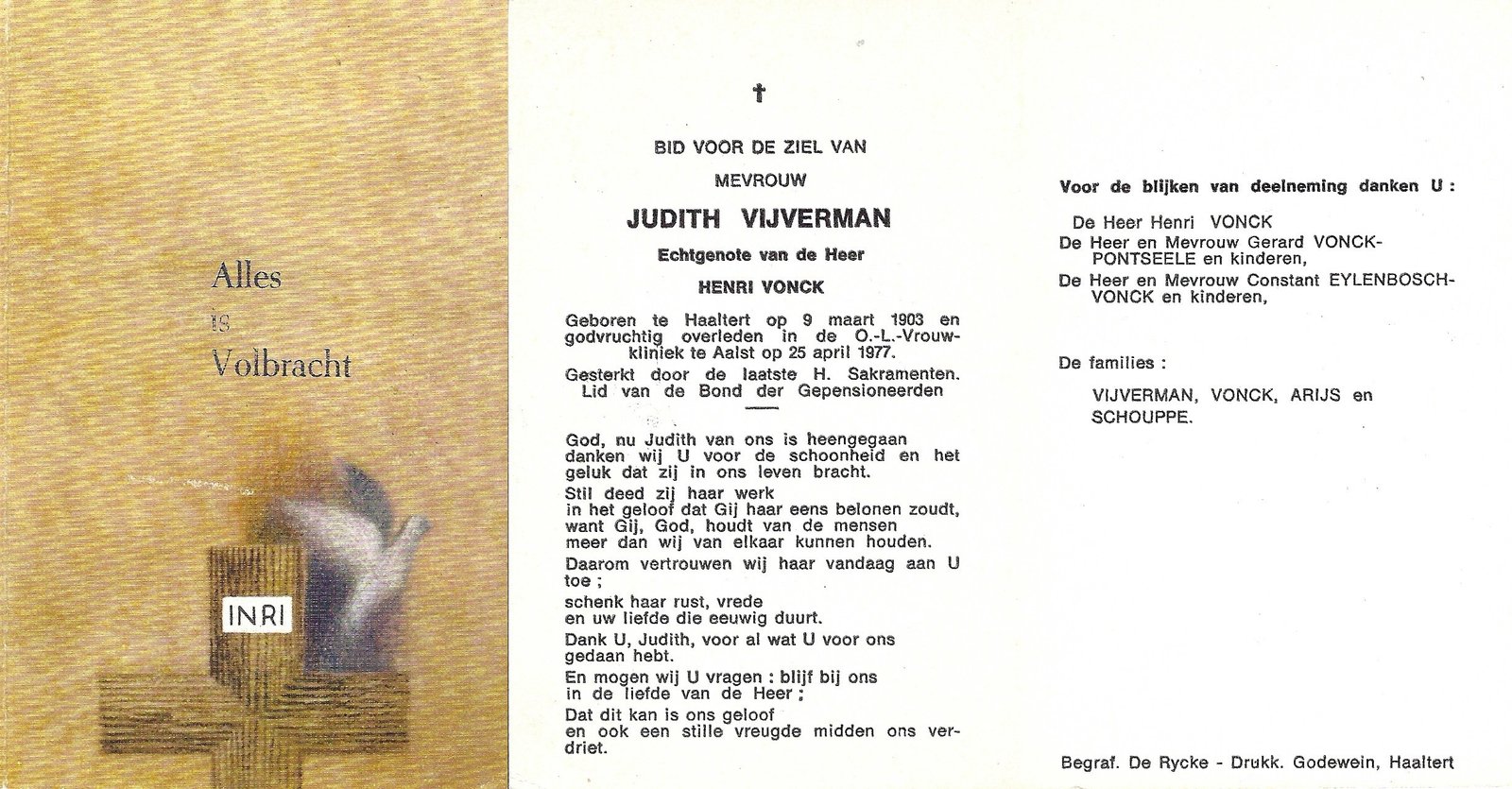 | Vijverman Judith | Vonck Henri | Haaltert | 09/03/1903 | Aalst | 25/04/1977 |