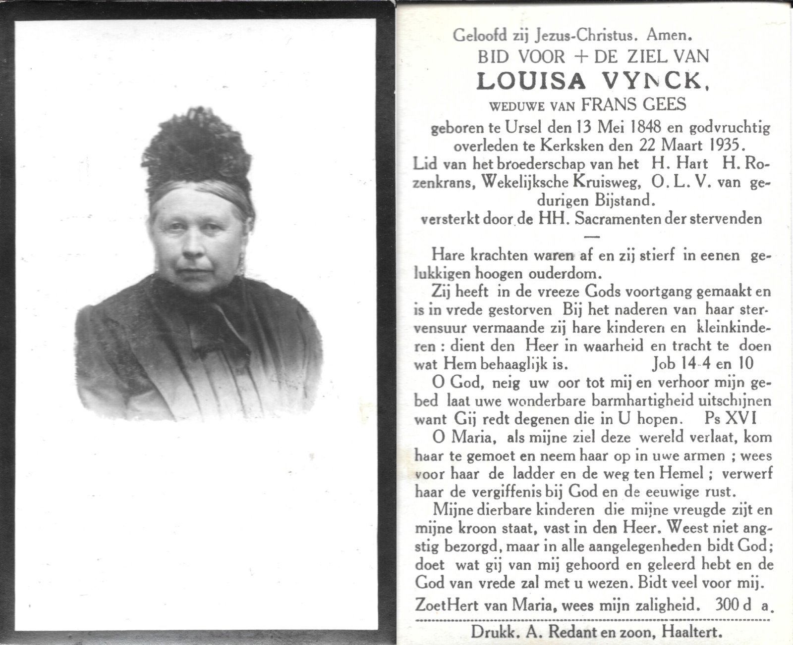 | Vynck Louisa | Gees Frans | Ursel | 13/05/1848 | Kerksken | 22/03/1935 |