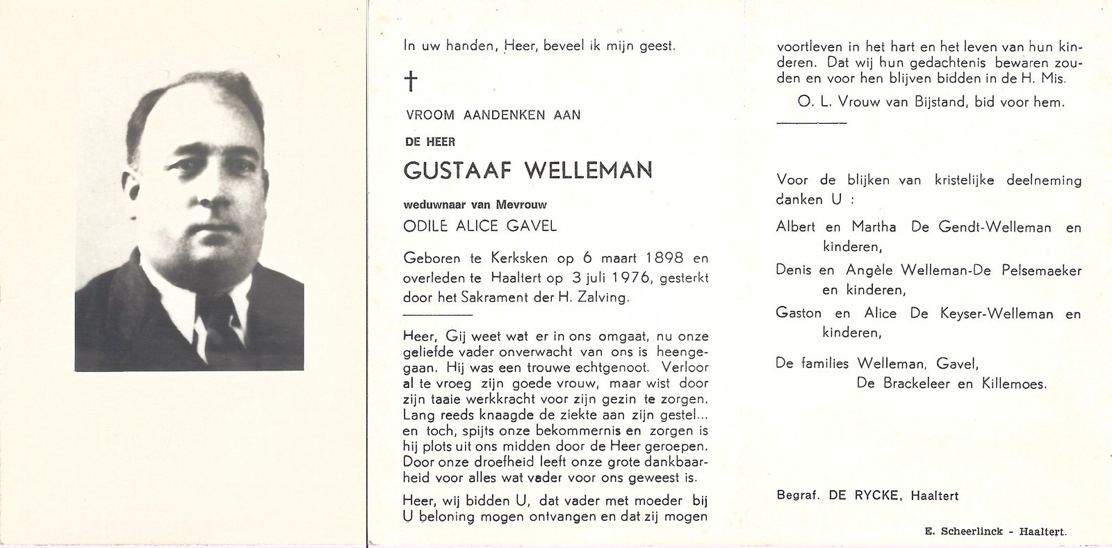 | Welleman Gustaaf | Gavel Odile Alice | Kerksken | 06/03/1898 | Haaltert | 03/07/1976 |