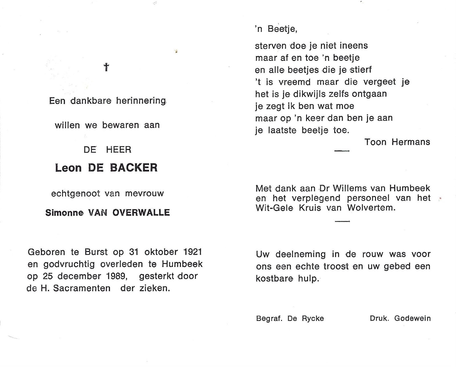 | De Backer Leon | Van Overwaelle Simonne | Burst | 31/10/1921 | Humbeek | 25/12/1989 |