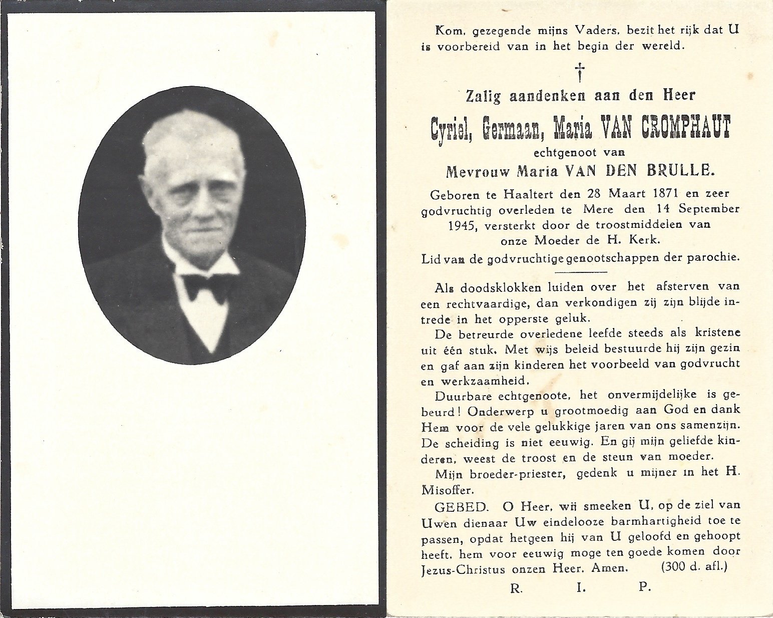 Van Cromphaut Cyriel Germaan MariaVan Den Brulle MariaHaaltert28/03/1871Mere14/09/1945