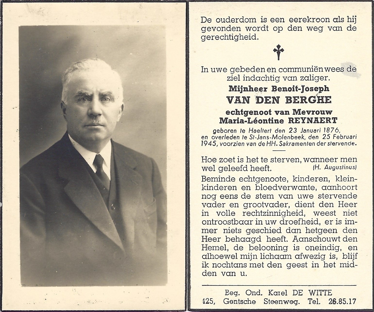 Van Den Berghe Benoit JosephReynaert Maria LéontineHaaltert23/01/1876Sint-Jans-Molenbeek25/02/1945