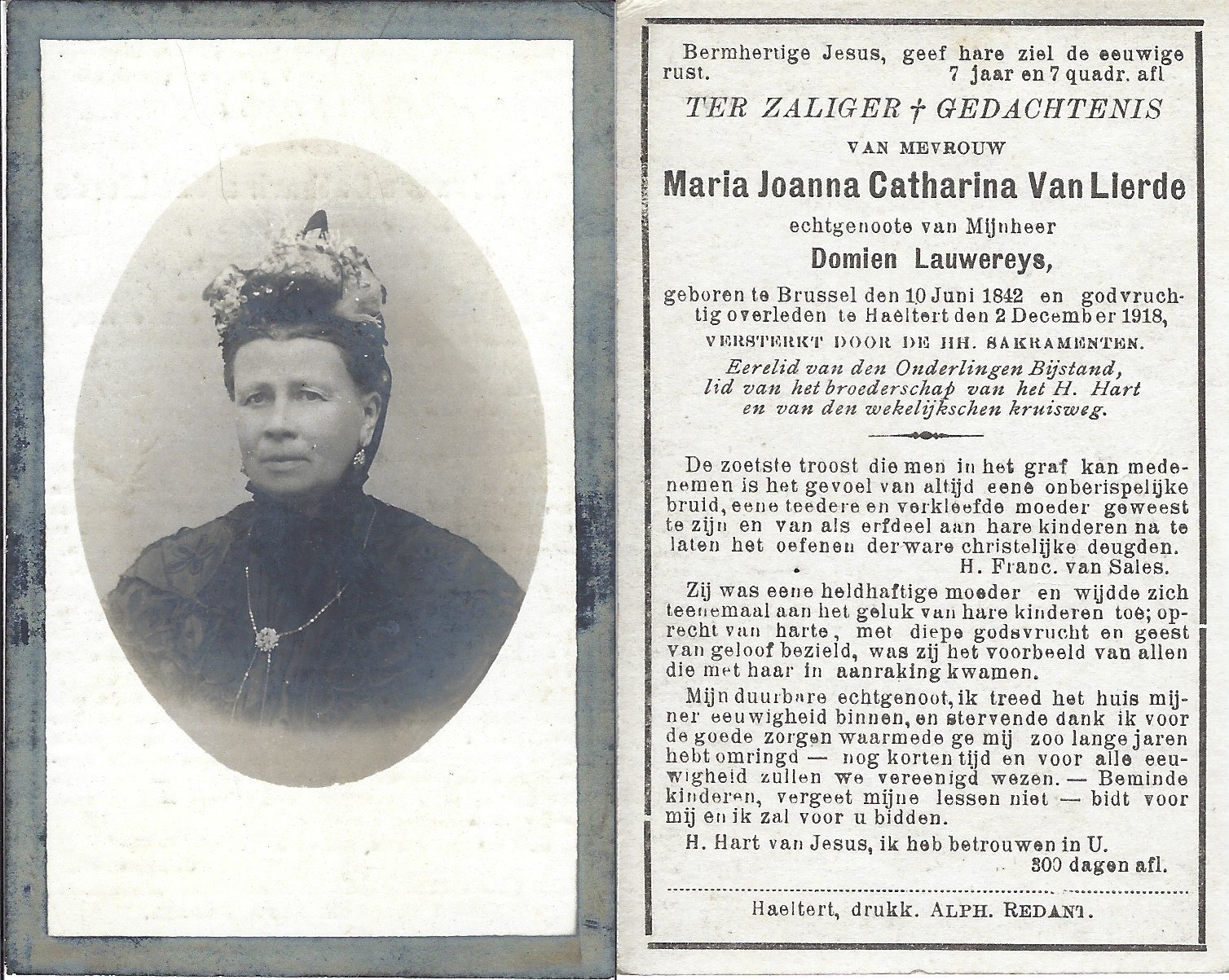 Van Lierde Maria Joanna CatharinaLauwereys DomienBrussel10/06/1842Haaltert02/12/1918