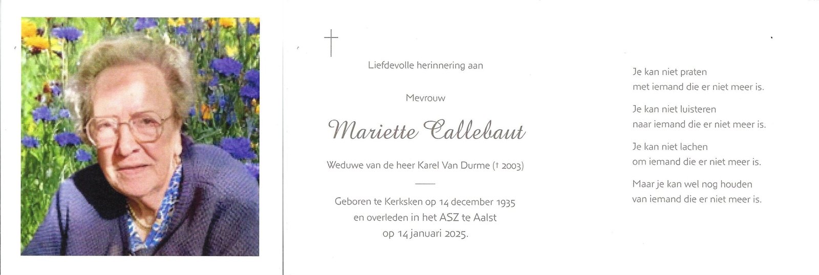 Callebaut MarietteVan Durme KarelKerksken14/12/1935Aalst14/01/2025