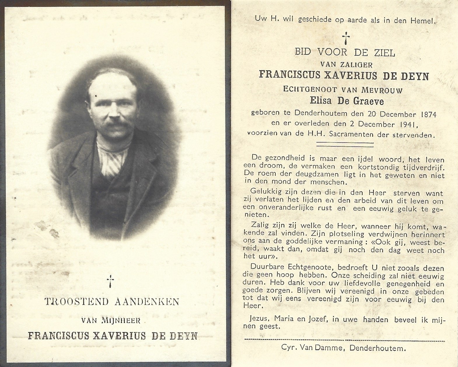 De Deyn Franciscus XaveriusDe Graeve ElisaDenderhoutem20/12/1874Denderhoutem02/12/1941