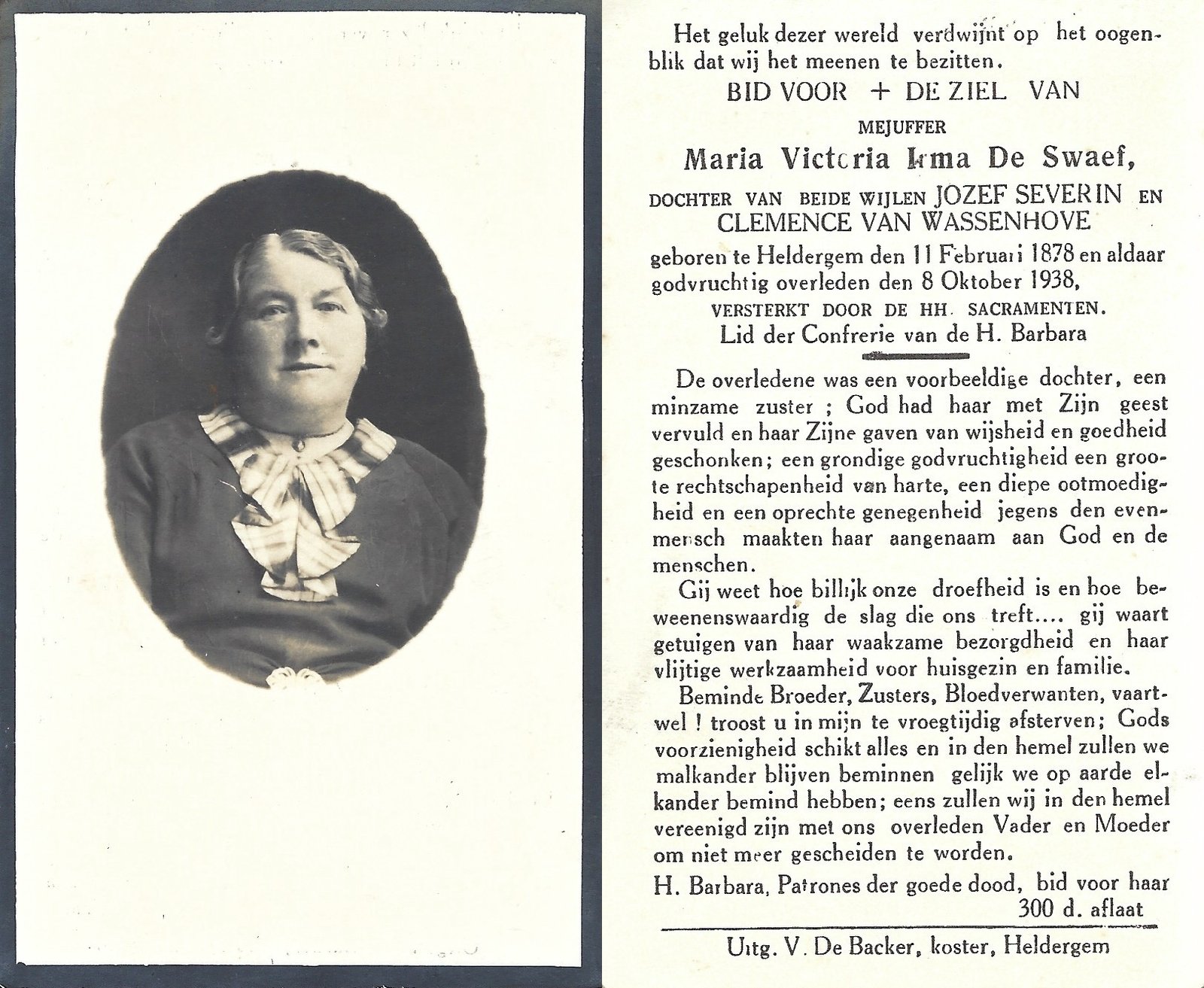 De Swaef Maria VictoriaSeverin Jozef en Van Wassenhove ClemensHeldergem11/02/1878Heldergem08/10/1938