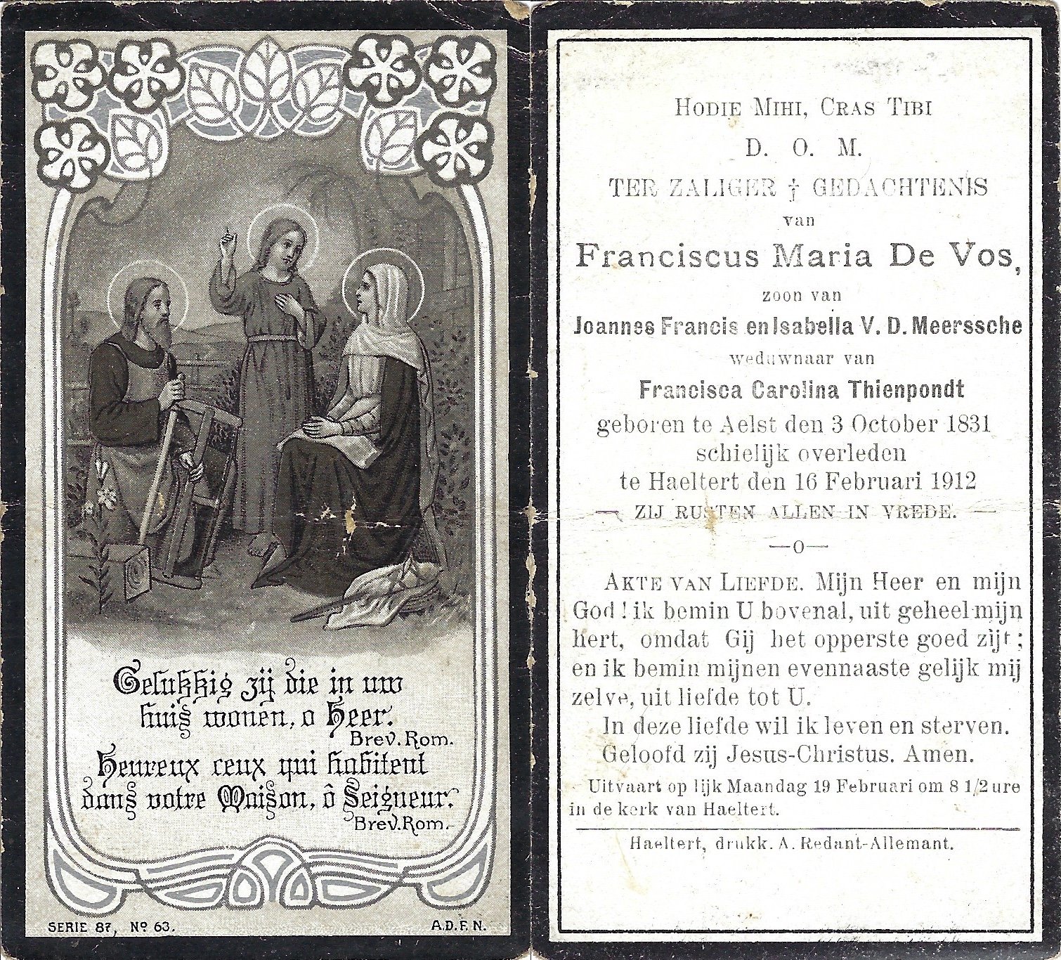 De Vos Franciscus MariaThienpondt Francisca CarolinaAalst03/10/1831Haaltert16/02/1912