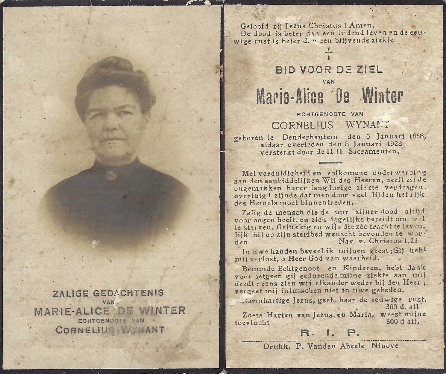 De Winter Marie-AliceWynant CorneliusDenderhoutem05/01/1868Denderhoutem08/01/1928