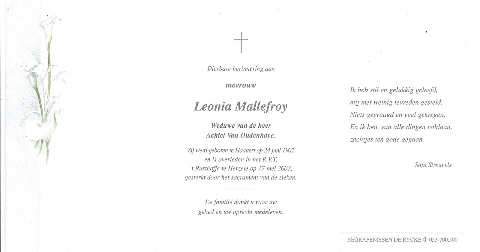 | Mallefroy Leonia | Van Oudenhove Achiel | Haaltert | 24/06/1902 | Herzele | 17/05/2003 |
