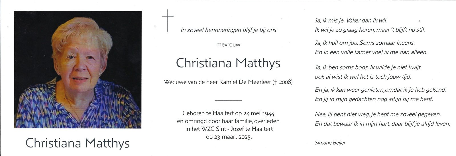 | Matthys Christiana | De Meerleer Kamiel | Haaltert | 24/05/1944 | Haaltert | 23/03/2025 |