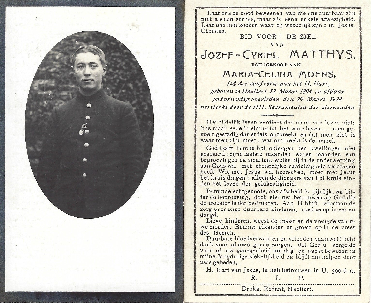 | Matthys Jozef Cyriel | Moens Maria Celina | Haaltert | 12/03/1894 | Haaltert | 29/03/1928 |