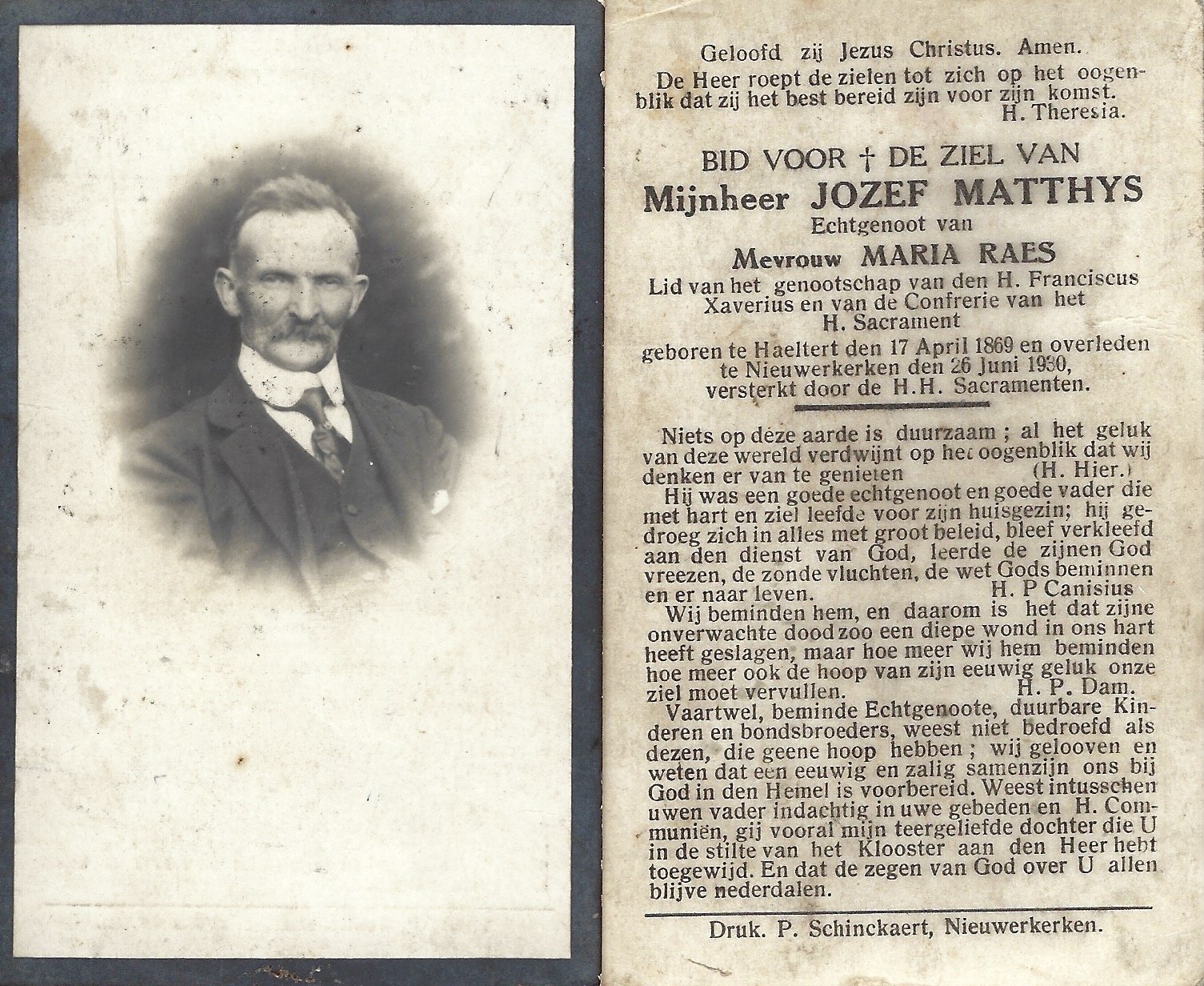 | Matthys Jozef | Raes Maria | Haaltert | 17/04/1869 | Nieuwerkerken | 26/06/1930 |