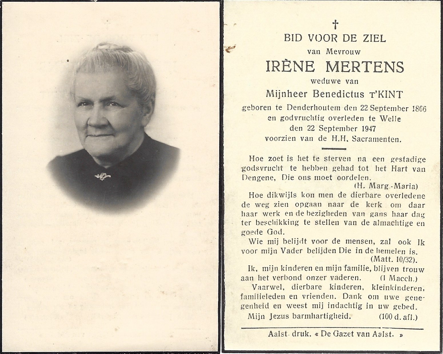 | Mertens Irène | ’t Kint | Denderhoutem | 22/09/1866 | Welle | 22/09/1947 |