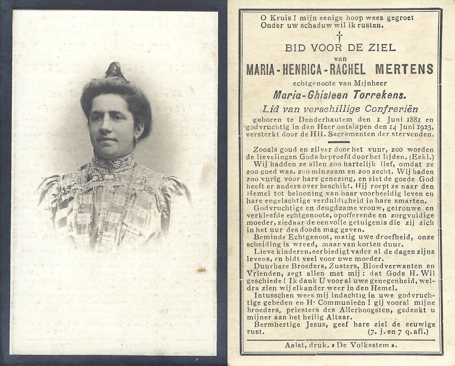 | Mertens Maria Henrica Rachel | Torrekens Maria Ghisleen | Denderhoutem | 01/06/1881 | Denderhoutem | 14/06/1923 |