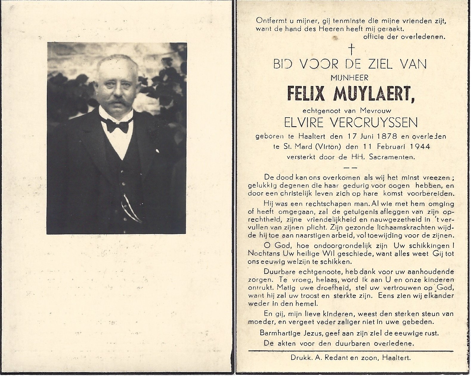 | Muylaert Felix | Vercruysse Elvire | Haaltert | 17/06/1878 | Saint-Mard | 11/02/1944 |