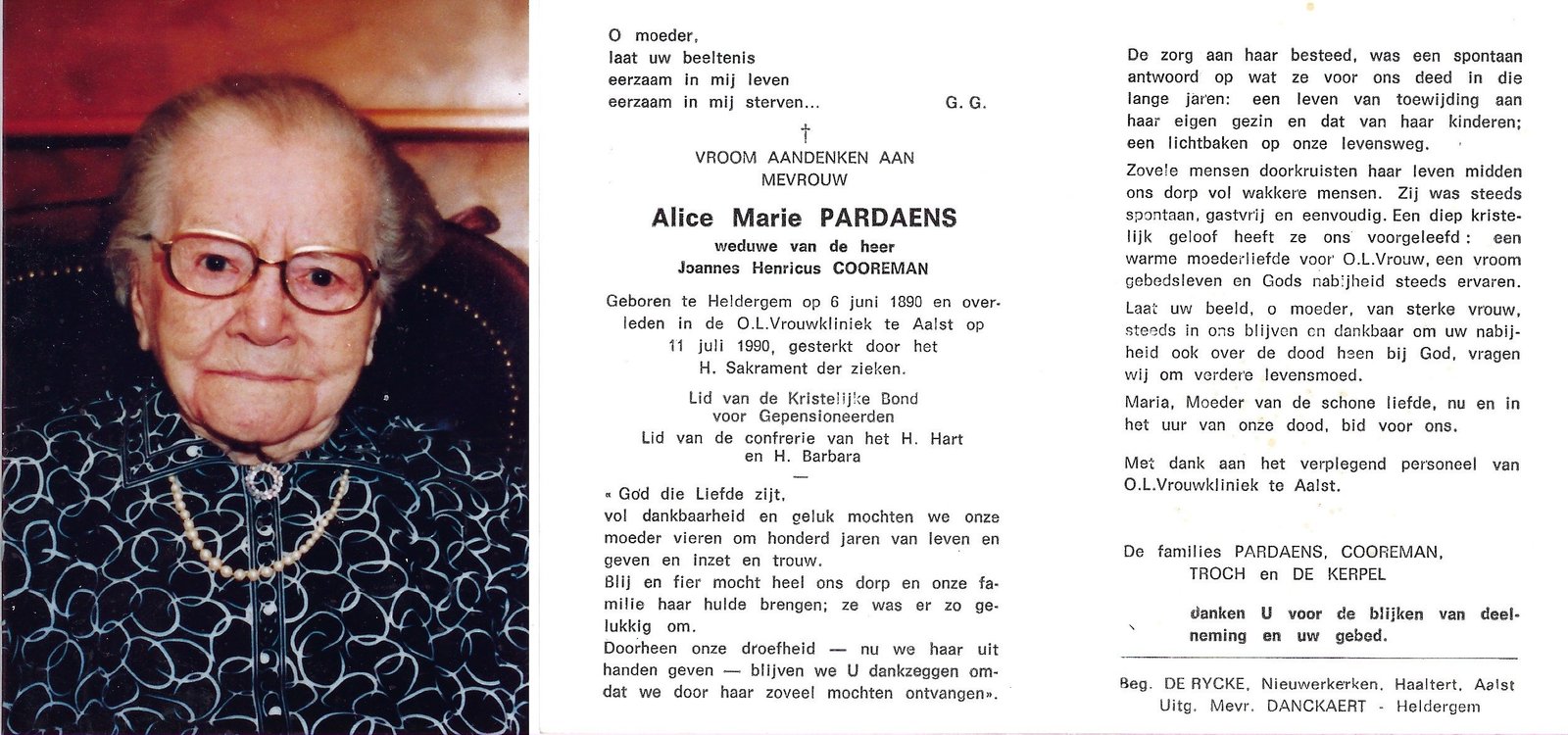 | Pardaens Alice Marie | Cooreman Henricus | Heldergem | 06/06/1890 | Aalst | 11/07/1990 |
