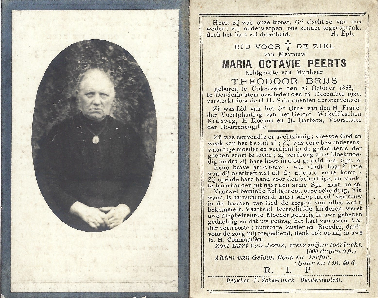| Peerts Maria Octavie | Brijs Theodoor | Onkerzele | 23/10/1858 | Denderhoutem | 18/12/1921 |
