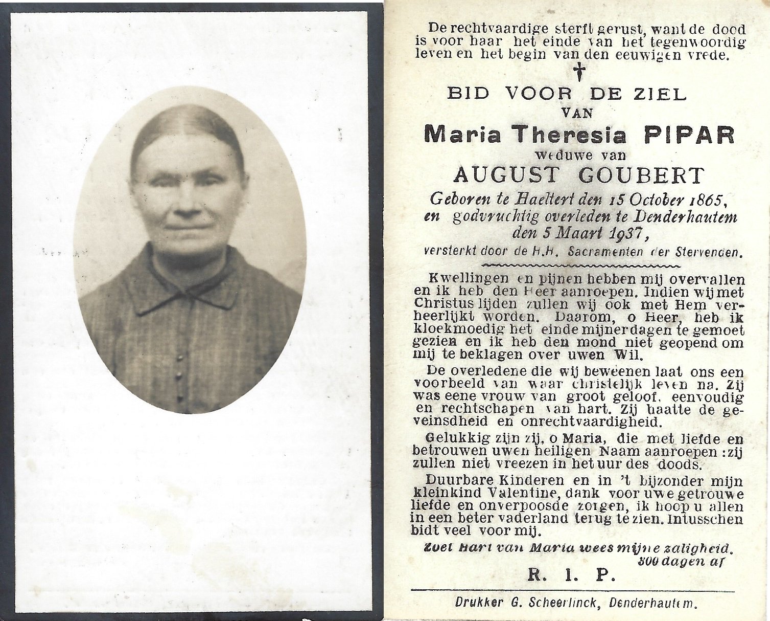 | Pipar Maria Theresia | Goubert August | Haaltert | 15/10/1865 | Denderhoutem | 05/03/1937 |