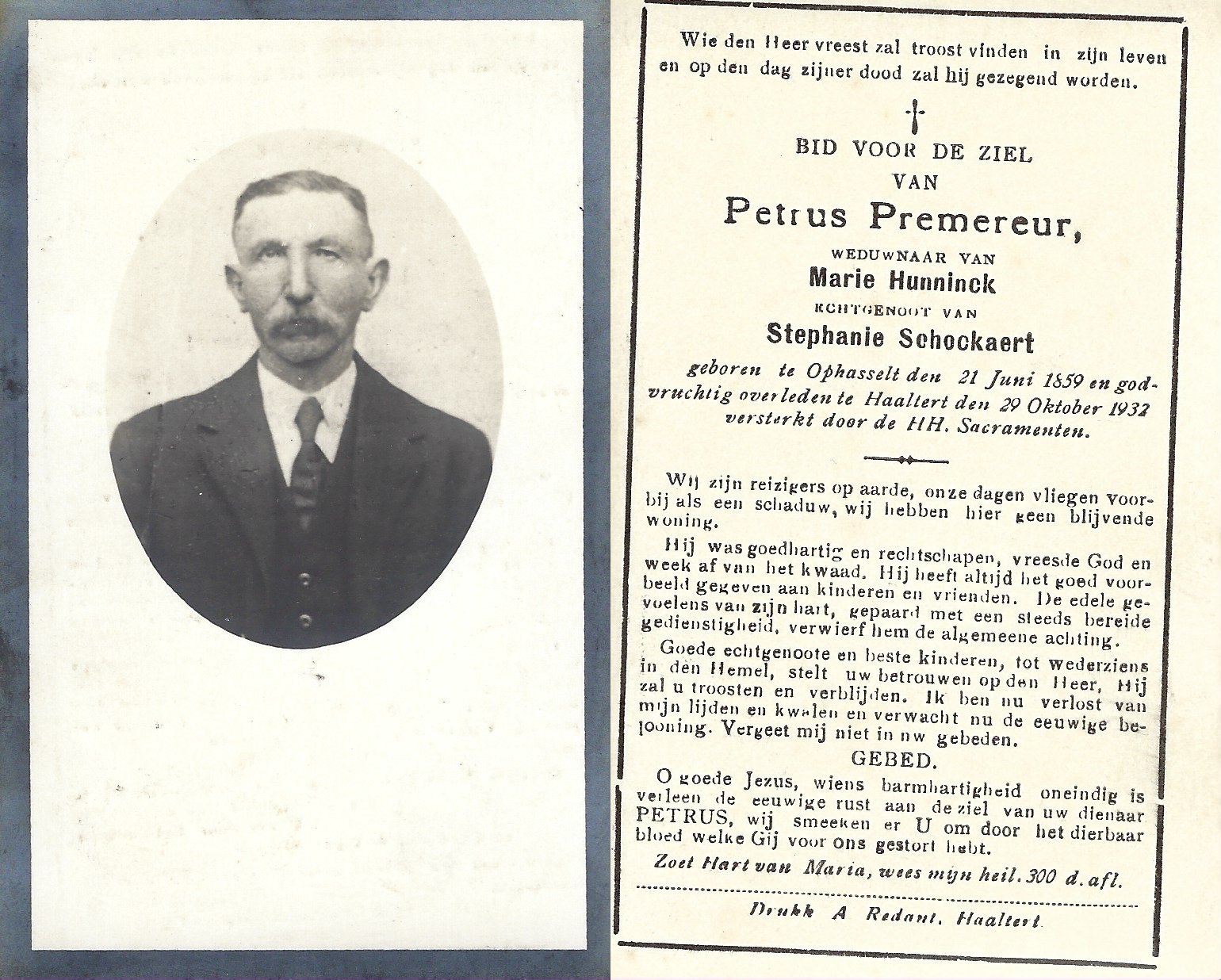 | Premereur Petrus | Hunninck Marie en Shockaert Stephanie | Ophasselt | 21/06/1859 | Haaltert | 29/10/1932 |