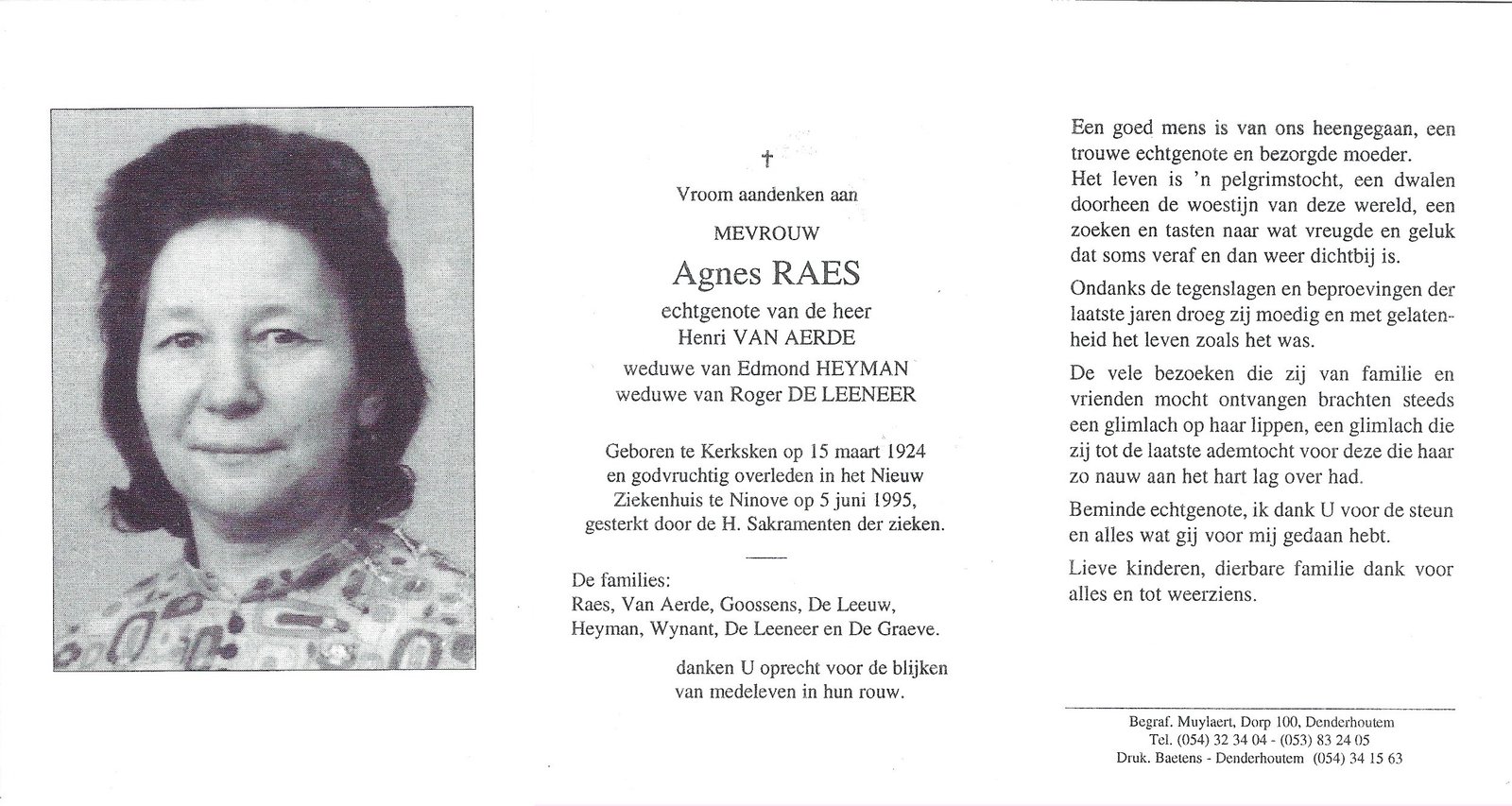 | Raes Agnes | Van Aerde Henri, Heyman Edmond en De Leeneer Roger | Kerksken | 15/03/1924 | Ninove | 05/06/1995 |