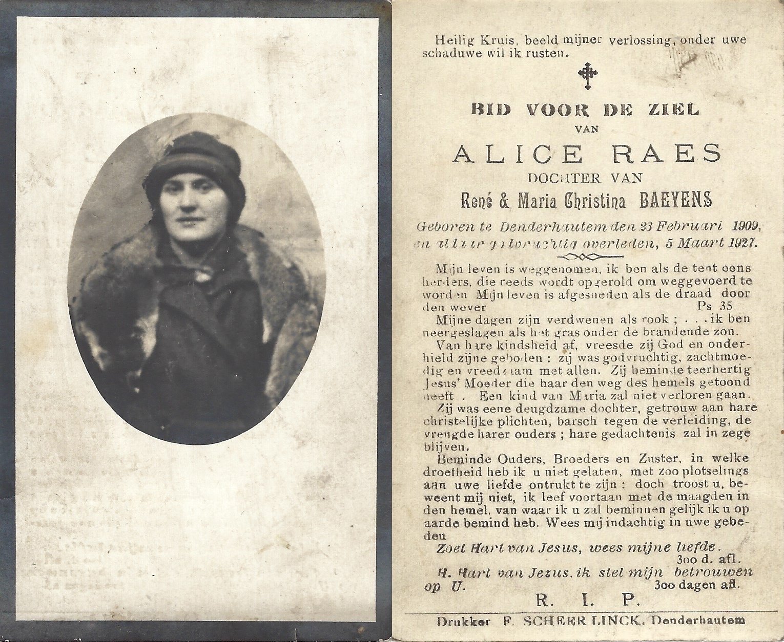 | Raes Alice | | Denderhoutem | 23/02/1909 | Denderhoutem | 05/03/1927 |