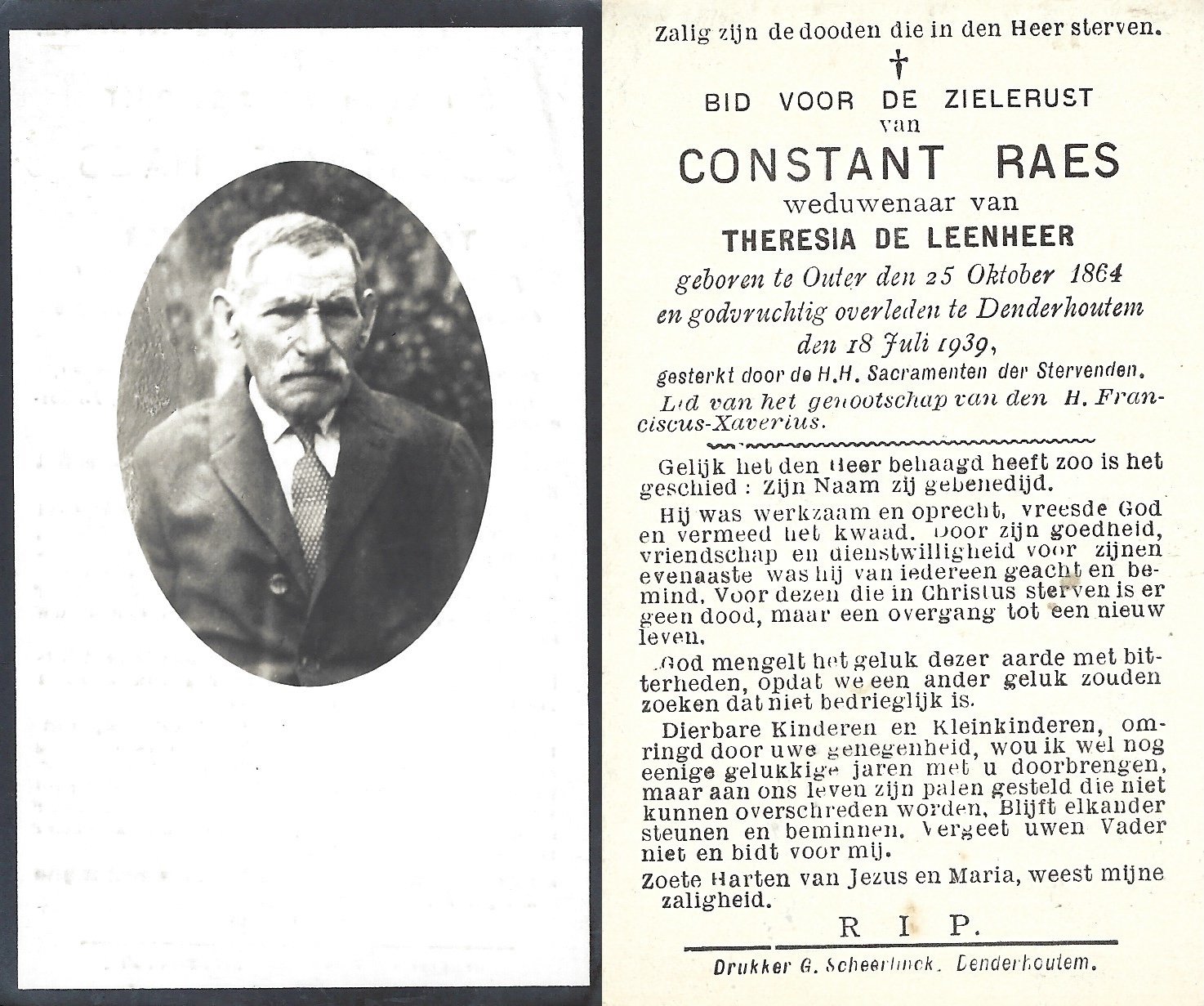 | Raes Constant | De Leenheer Theresia | Outer | 25/10/1864 | Denderhoutem | 18/07/1939 |