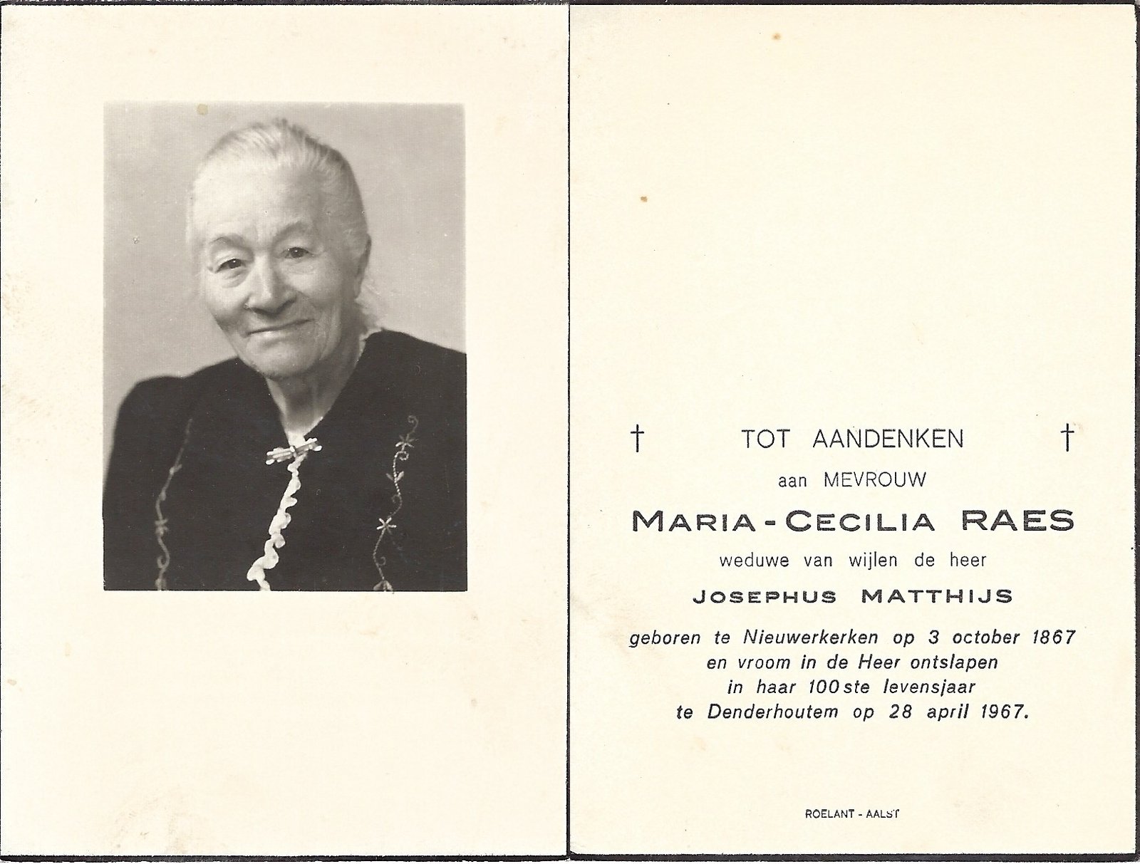 | Raes Maria Cecilia | Matthijs Josephus | Nieuwerkerken | 03/10/1867 | Denderhoutem | 28/04/1967 |