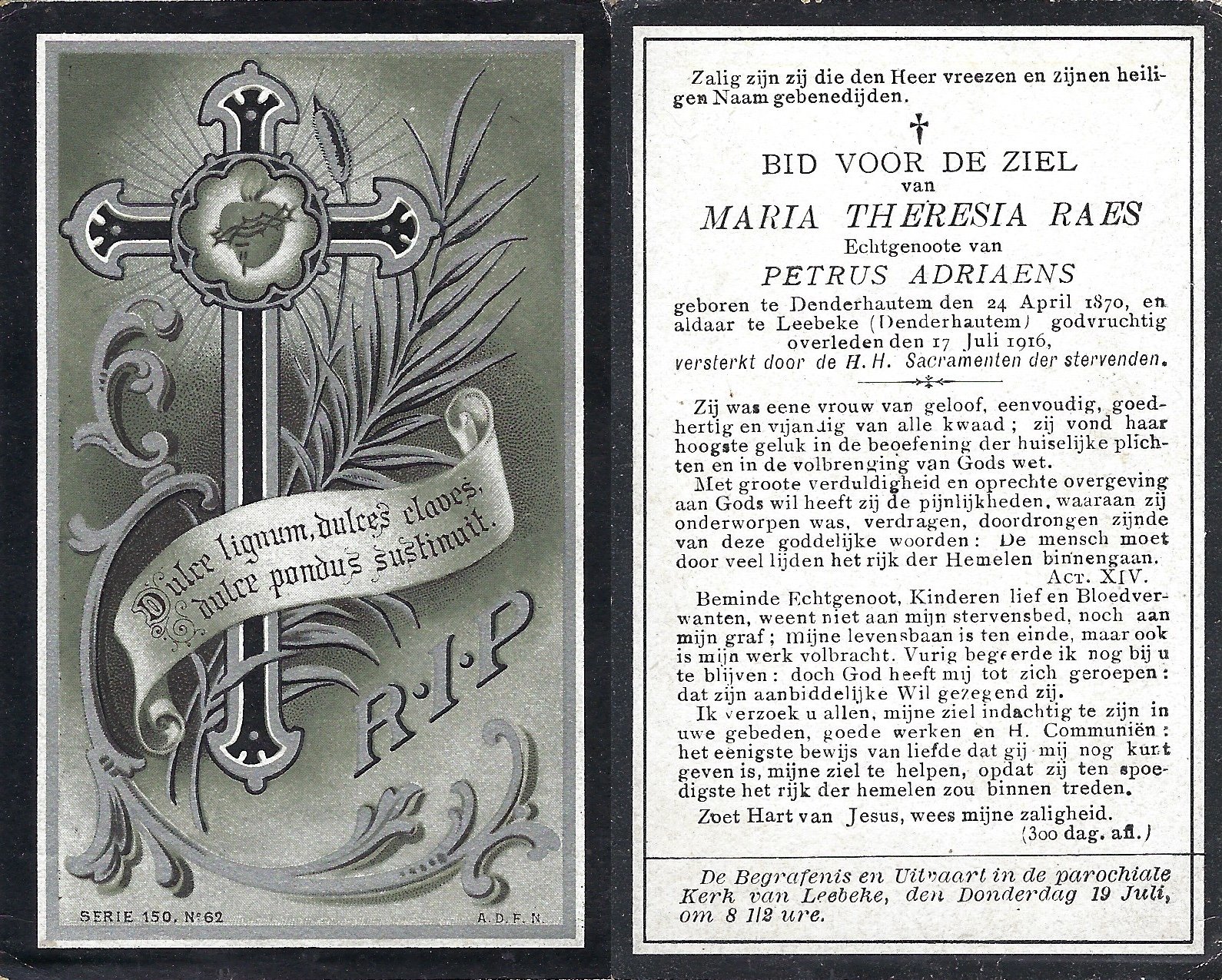 | Raes Maria Theresia | Adriaens Petrus | Denderhoutem | 24/04/1870 | Denderhoutem | 17/07/1916 |