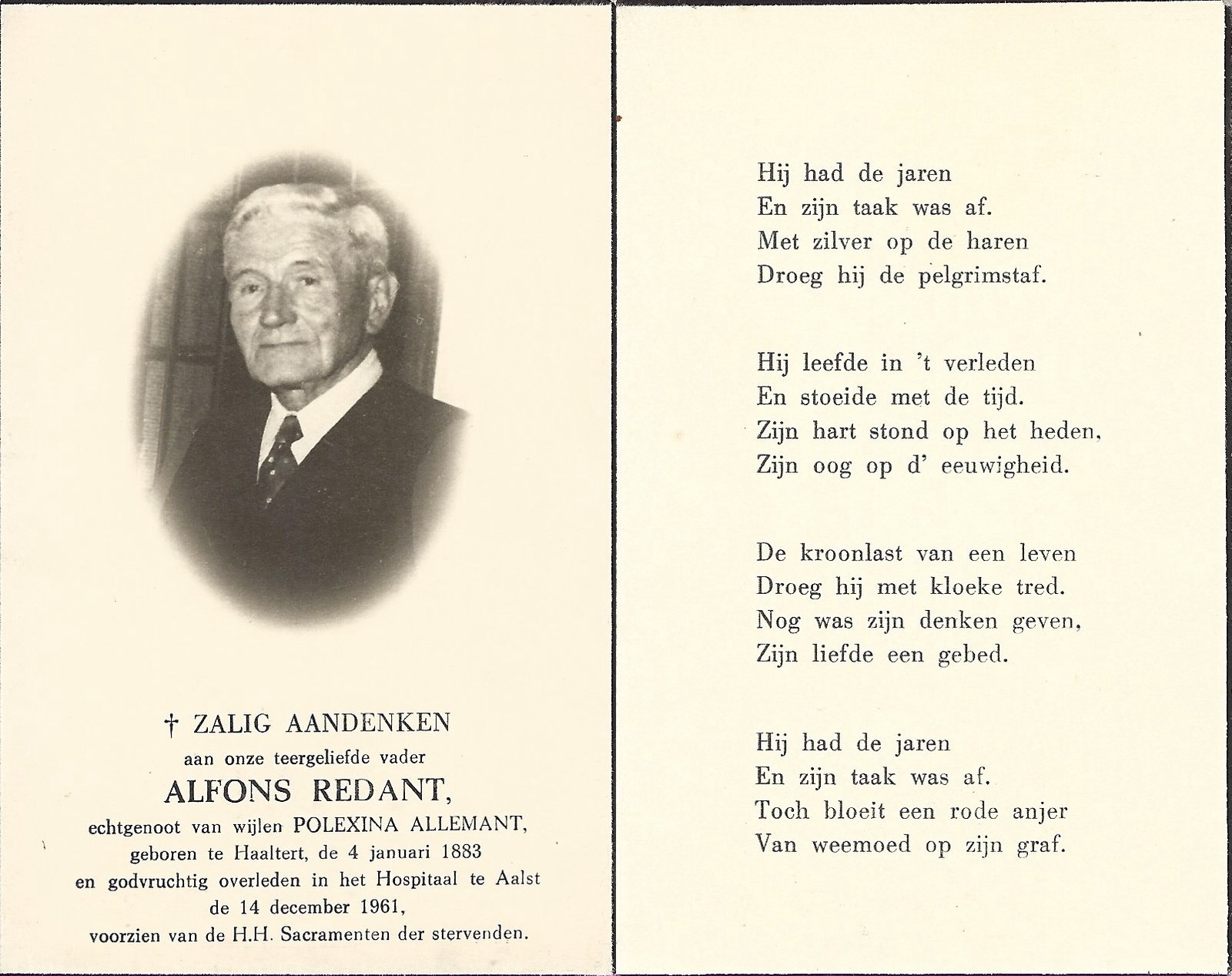 | Redant Alfons | Allemant Polexina | Haaltert | 04/01/1883 | Aalst | 14/12/1961 |
