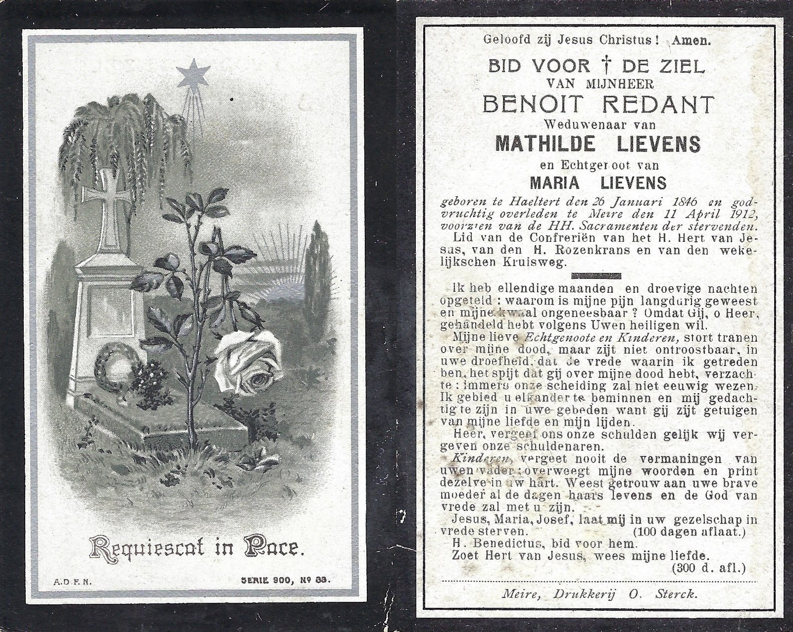 | Redant Benoit | Lievens Mathilde en Lievens Maria | Haaltert | 26/01/1846 | Mere | 11/04/1912 |