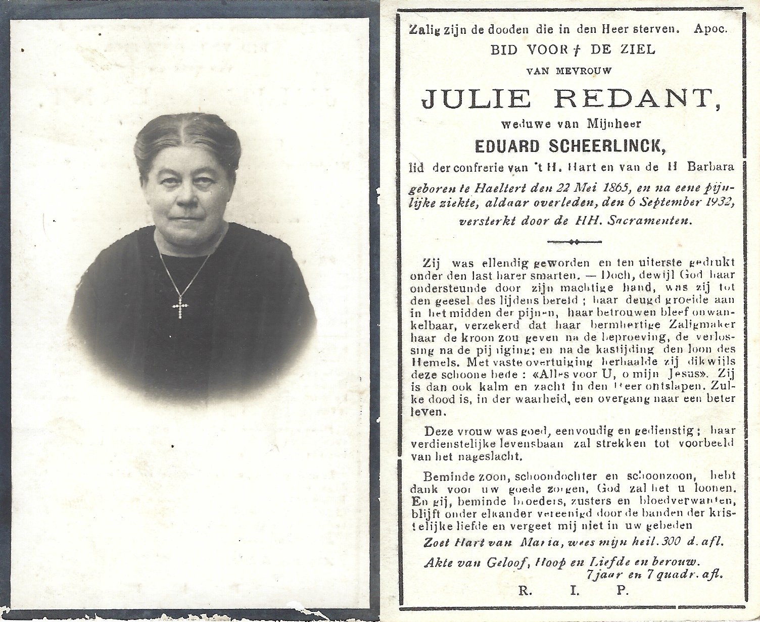 | Redant Julie | Scheerlinck Eduard | Haaltert | 22/05/1865 | Haaltert | 06/09/1932 |