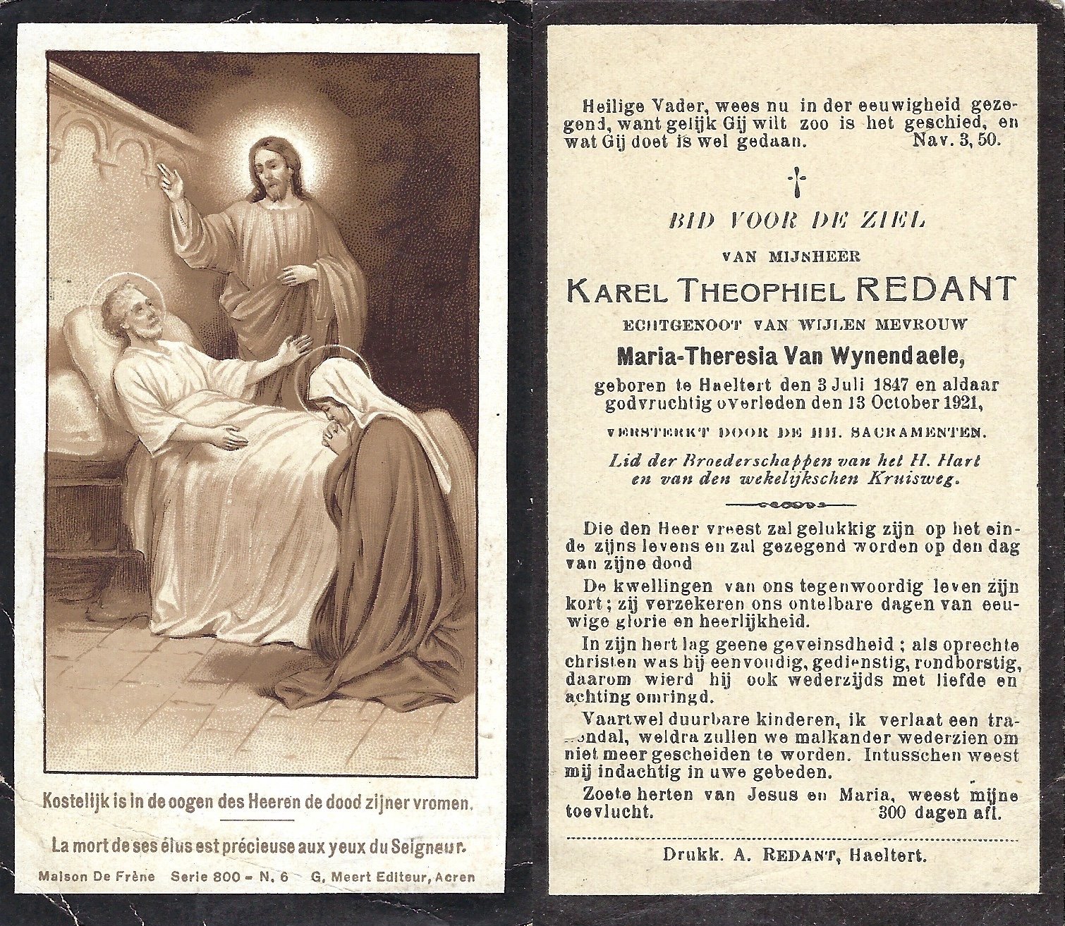 | Redant Karel Theophiel | Van Wynendaele Maria Theresia | Haaltert | 03/07/1847 | Haaltert | 13/10/1921 |