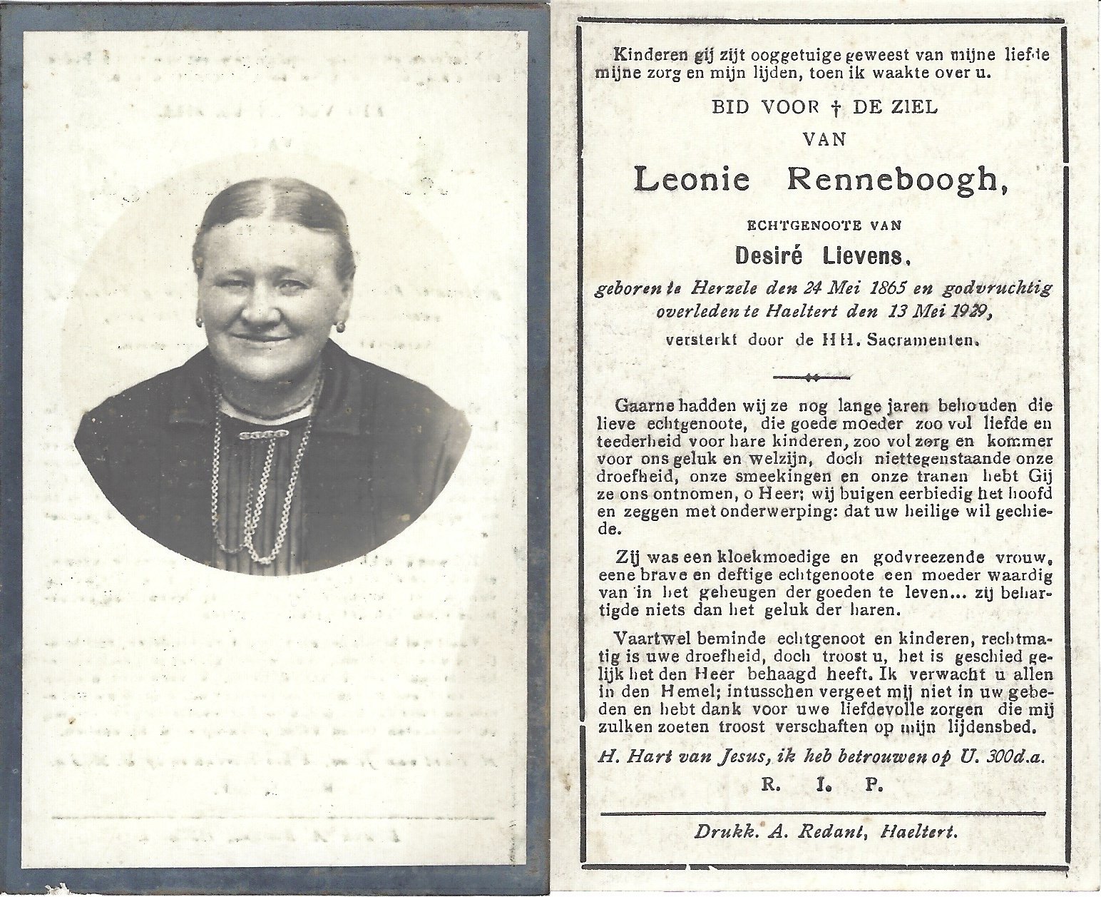 | Renneboogh Leonie | Lievens Desiré | Herzele | 24/05/1865 | Haaltert | 13/05/1929 |