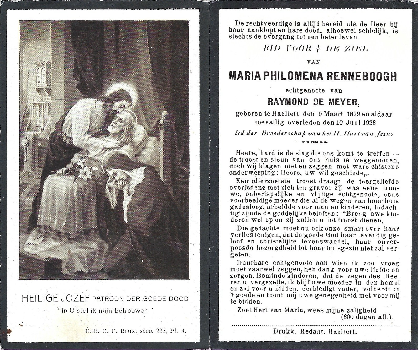 | Renneboogh Maria Philomena | De Meyer Raymond | Haaltert | 09/03/1879 | Haaltert | 10/06/1923 |