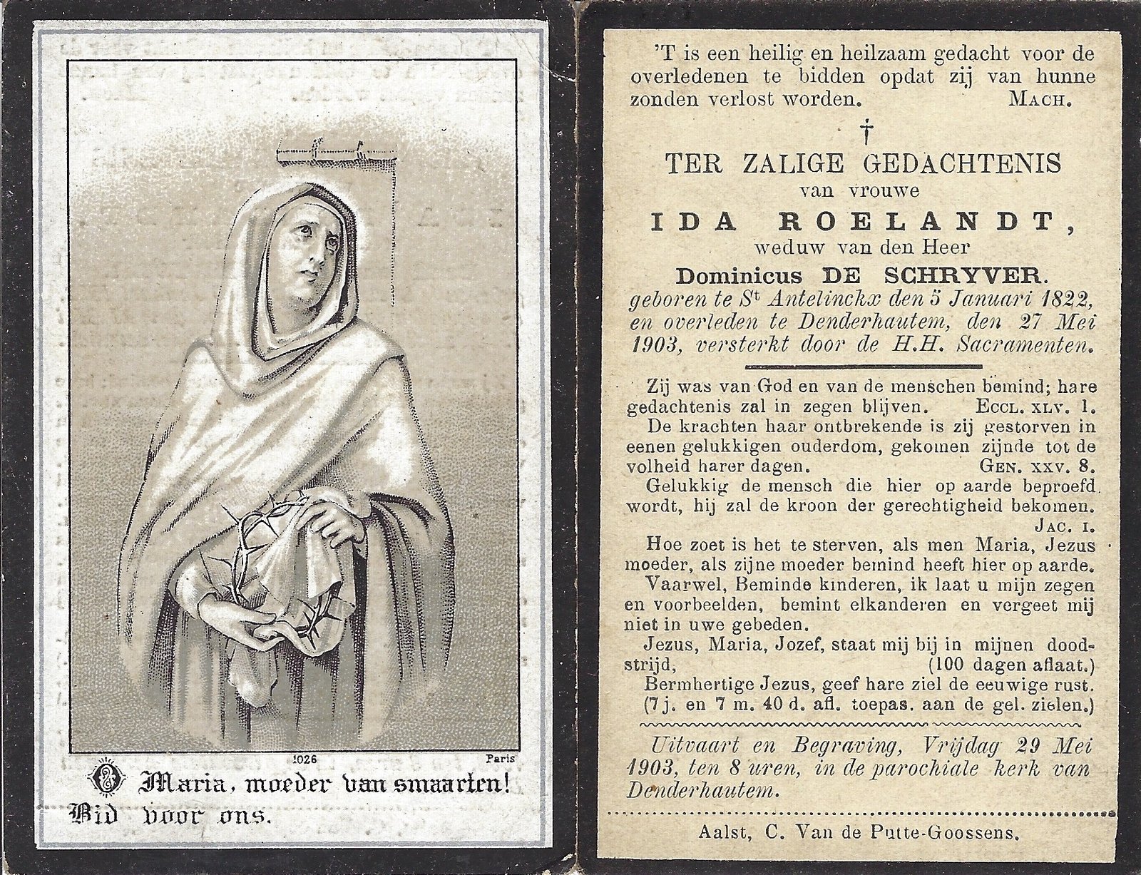 | Roelandt Ida | De Schryver Dominicus | Sint-Antelinks | 05/01/1822 | Denderhoutem | 27/05/1903 |