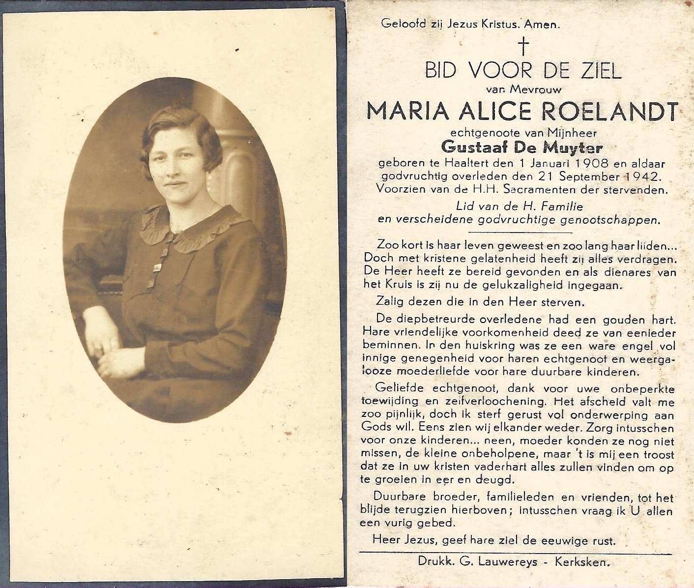 | Roelandt Maria Alice | De Muyter Gustaaf | Haaltert | 01/01/1908 | Haaltert | 21/09/1942 |