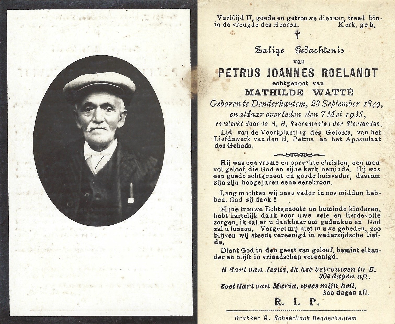 | Roelandt Petrus Joannes | Watté Mathilde | Denderhoutem | 23/09/1849 | Denderhoutem | 07/05/1935 |