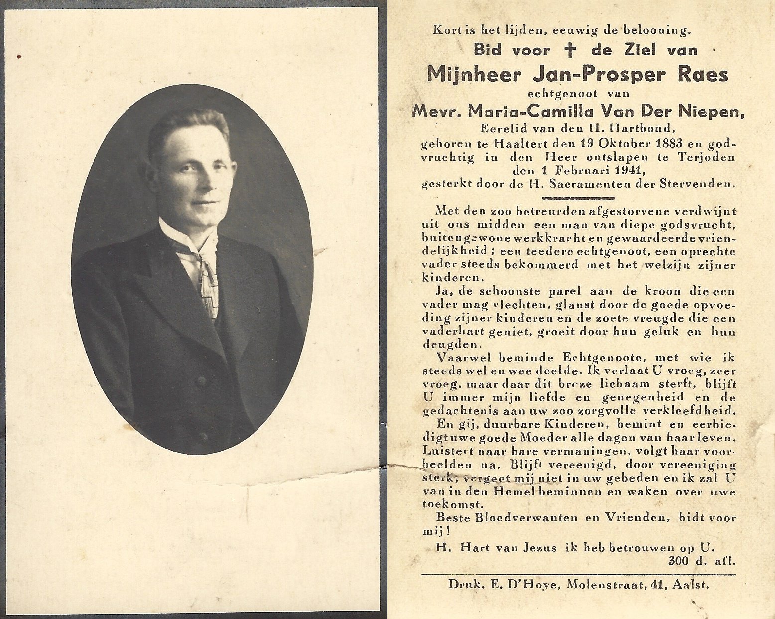 | Raes Jan Prosper | Van Der Niepen Maria Camilla | Haaltert | 19/10/1883 | Terjoden | 01/02/1941 |