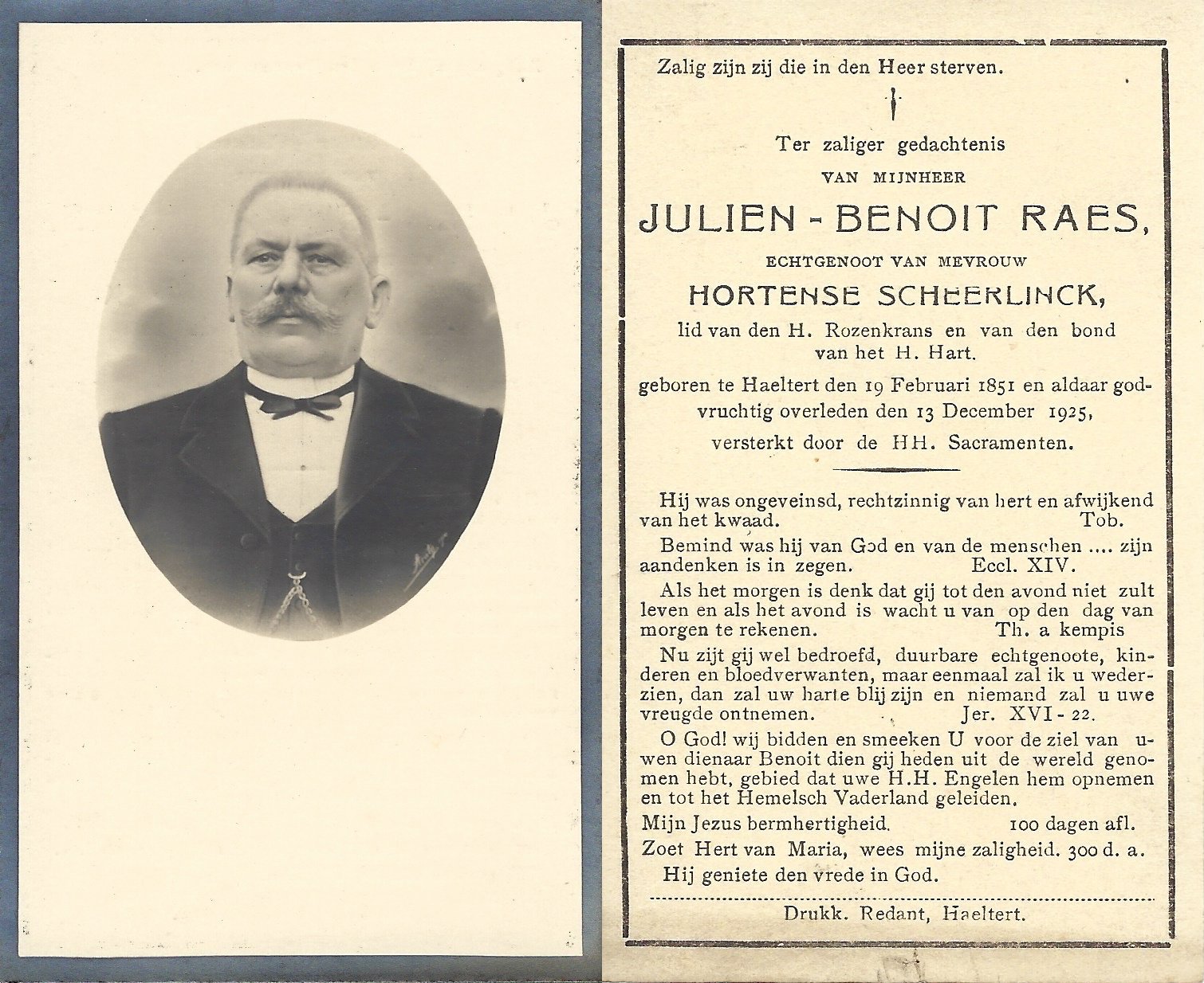 | Raes Julien Benoit | Scheerlinck Hortense | Haaltert | 19/02/1851 | Haaltert | 13/12/1925 |