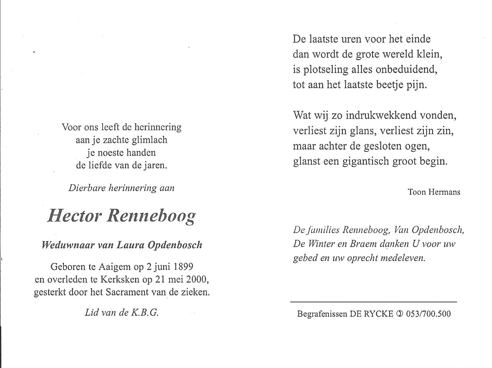 | Renneboog Hector | Opdenbosch Laura | Aaigem | 02/06/1899 | Kerksken | 21/05/2000 |
