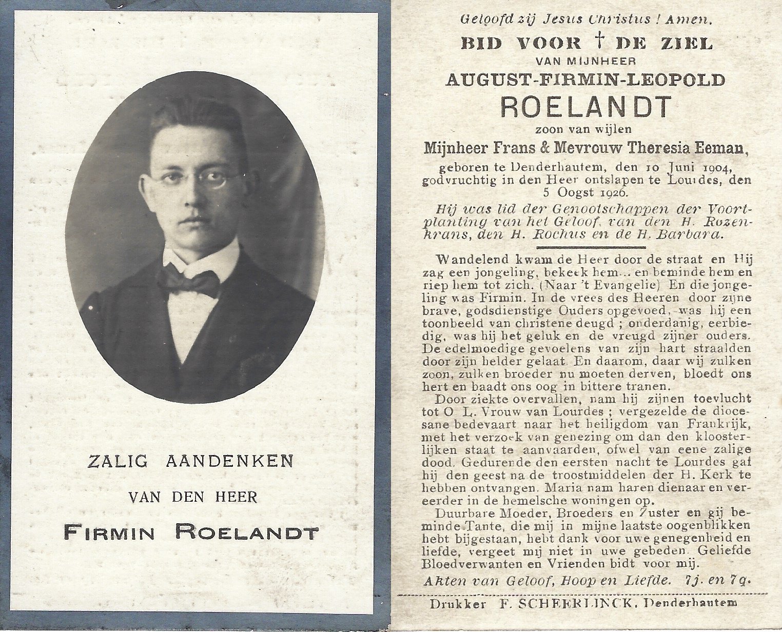 | Roelandt August Firmin Leopold | | Denderhoutem | 10/06/1904 | Lourdes | 05/08/1926 |