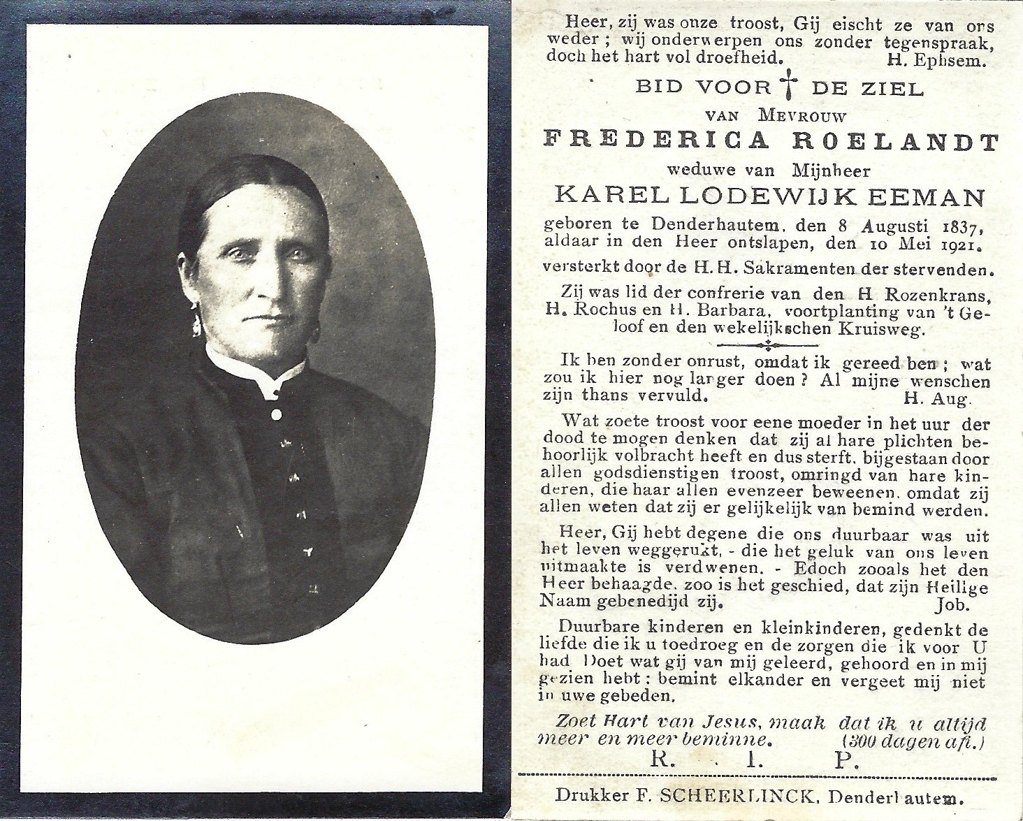 | Roelandt Frederica | Eeman Karel Lodewijk | Denderhoutem | 08/08/1837 | Denderhoutem | 10/05/1921 |
