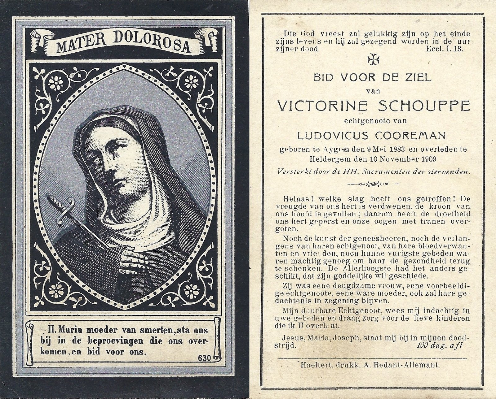 | Schouppe Victorine | Cooreman Ludovicus | Aaigem | 09/05/1883 | Heldergem | 10/11/1909 |